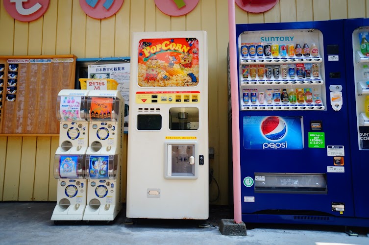 自販機コーナーにはレトロなポップコーン自動販売機がありました。